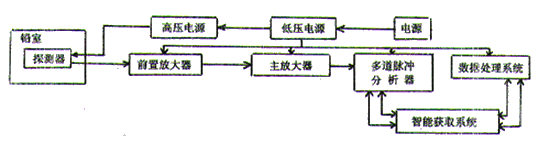 能譜數據獲取與處理系統:由ADC智能獲取接口和計算機組成。探測器到ADC進行模—數轉換,智能獲取接口對ADC的每個復換碼進行實時處理、顯示、數據壓縮,并每隔一定時間將已壓縮的數據由接口傳送至計算機,已進行譜顯示的更新,每個譜的長度、寬度、停機方式和條件,起、停都由計算機獨立控制。在測量過程中,計算機可以停機或處理其它數據。